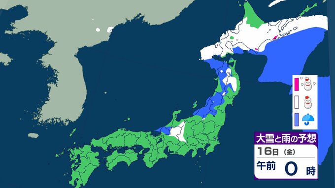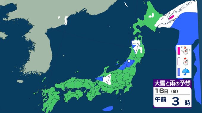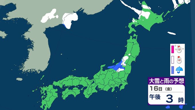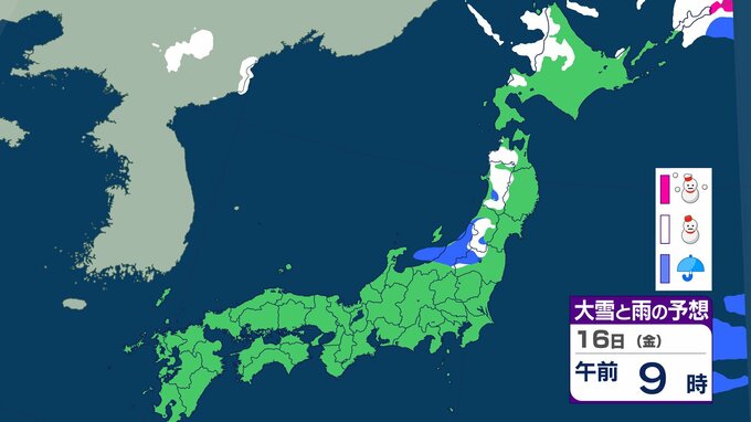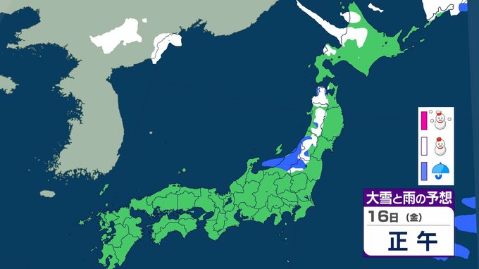 ニュースクリップ 【大雪情報】関東甲信でも大雪に警戒 北日本と東日本で大雪や猛ふぶき 最大降雪量80cm 交通障害に注意・警戒 【大雪と雨のシミュレーション】 2026年1月11日(日) 10:15 国内 天気 16日(金)の雨と雪のシミュレーション