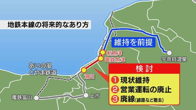 沿線自治体は「滑川―宇奈月温泉」間のうち新魚津から宇奈月温泉までの維持を前提とした一方で、電鉄魚津を含む「滑川ー新魚津」間の存続については現状維持、営業運転の廃止、廃線の3つに絞って検討を進めています。