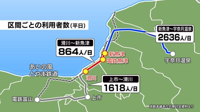 同区間はあいの風とやま鉄道との平行区間でもあり、「滑川―新魚津」間の利用者数は平日1日あたり864人です。