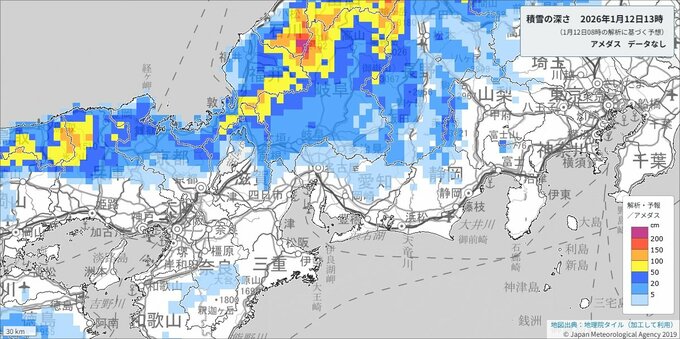愛知県の平地や岐阜県では、警報級の大雪となっている所があります。12日朝にかけて大雪や路面凍結による交通障害に警戒してください。