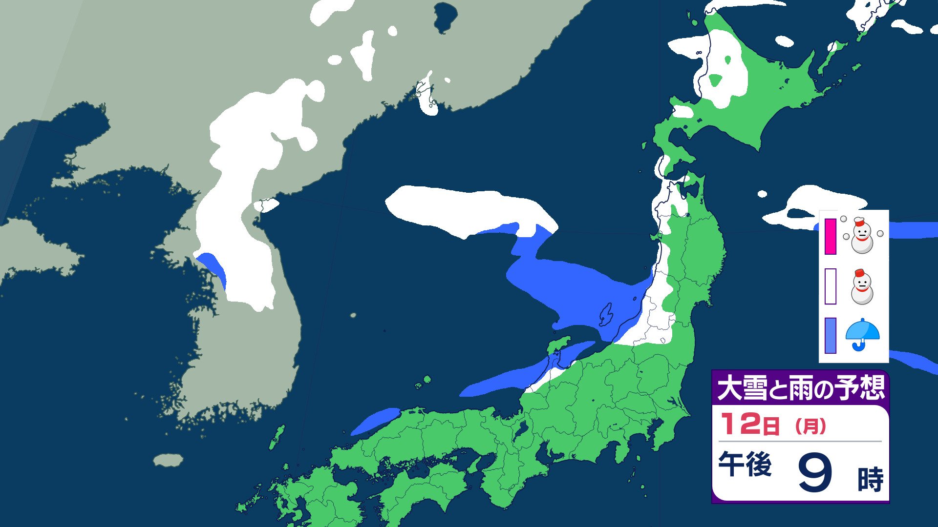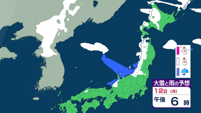 ニュースクリップ 北陸地方 最大瞬間風速30mか…海上中心に非常に強い風 海は大しけのところも 13日夜遅くにかけて 強風に注意・警戒を【大雪と雨のシミュレーション】 2026年1月12日(月) 16:12 国内 天気 12日(月)の雨と雪のシミュレーション