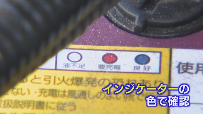 「これはバッテリー液が見られるタイプになっているので。こういう風に線が上と下にありますこの上と下の間に入っていれば大丈夫だと言うことになるのですが。軽くゆすっていただくとこの液がゆらゆらと揺れてると思います」