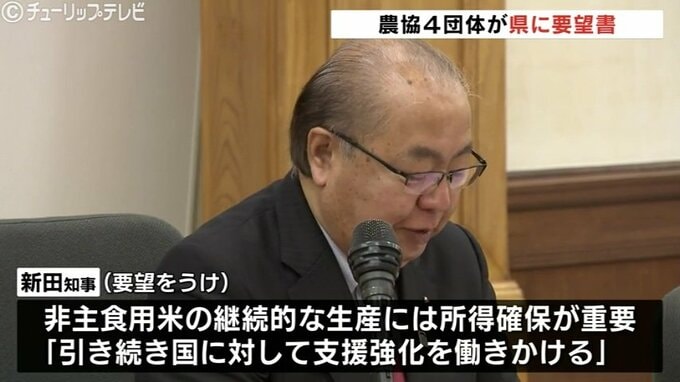 要望をうけ、新田知事は、非主食用米の継続的な生産には所得の確保が重要であるとして、「引き続き国に対して支援強化を働きかける」などと述べました。