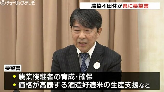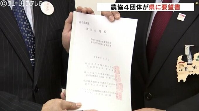富山県内の農協関係団体が来年度の県の予算編成を前に、農業政策の充実を求める要望書を13日、新田八朗知事に提出しました。
