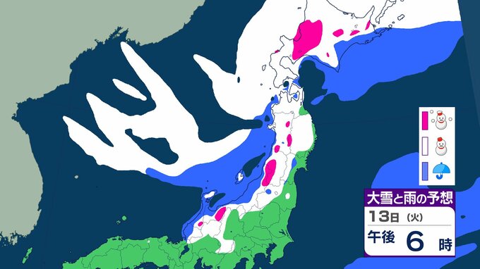 ニュースクリップ 【気象情報】14日(水)にかけ暴風雪、大荒れのおそれ…発達した低気圧が日本海西部を進む【気象庁】最大瞬間風速35メートル予想…落雷や竜巻、ひょうに注意【大雪と雨のシミュレーション】 2026年1月13日(火) 15:20 国内 天気 13日(火)の雨と雪のシミュレーション