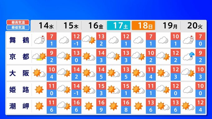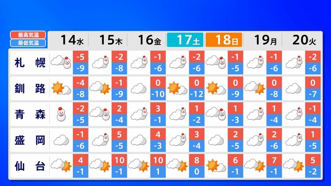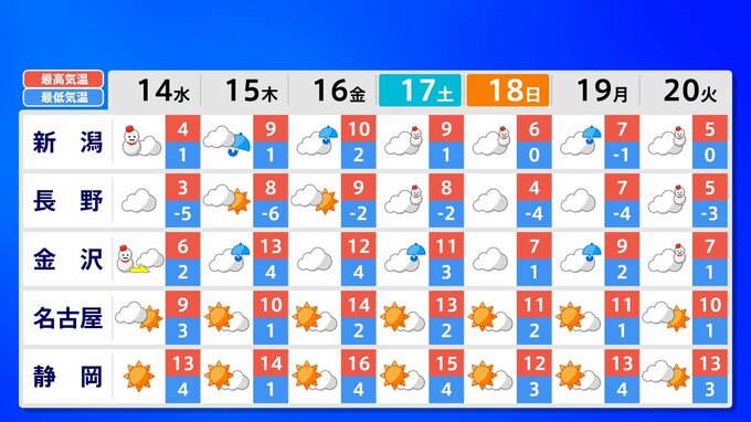 ニュースクリップ 北海道から沖縄まで 日本全国が対象…この時期としては“10年に一度”程度しか起きないような著しい低温の可能性 20日ごろから 日本海側は大雪の可能性 気象庁が早期天候情報発表 2026年1月13日(火) 15:38 国内 天気 全国の週間天気予報と予想気温は?