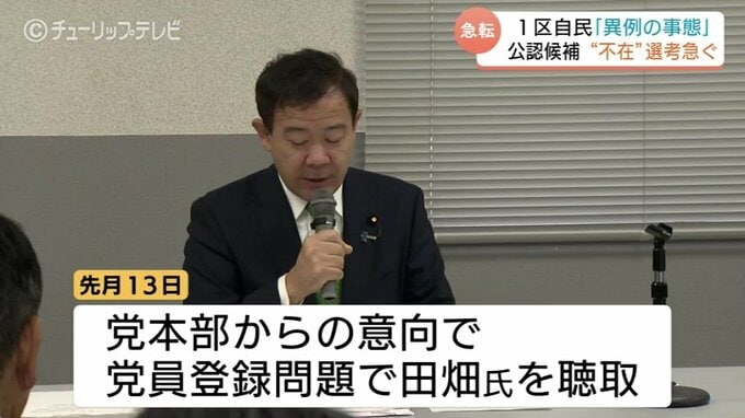 現在、県連と富山市連は、田畑氏以外の支部長の選ぶ方針で選考作業を進めていましたが、12月13日、党本部からの意向で2024年11月に発覚した党員登録問題について田畑氏への聴取を行いました。