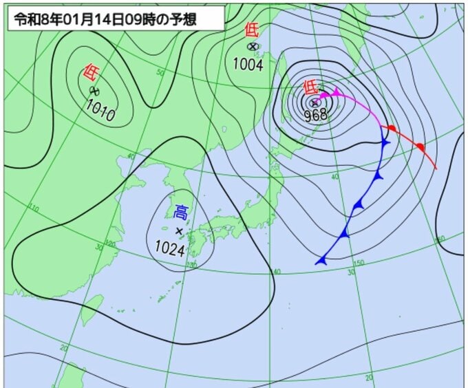 気象庁によりますと、急速に発達している低気圧が北海道付近にあって、14日には更に発達してオホーツク海に進み、寒冷前線が東日本から北日本を通過する見込みです。このため、北日本と北陸地方では14日にかけて、大荒れや大しけとなる所がある見込みです。また、北日本から東日本では13日は、低気圧や前線に向かう暖かく湿った空気の影響で、大気の状態が非常に不安定となっています。