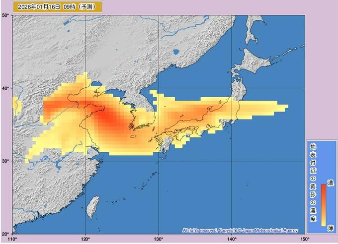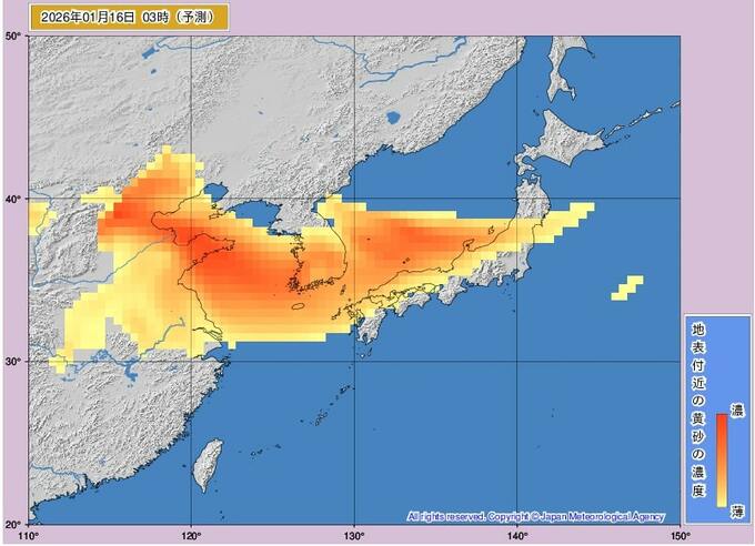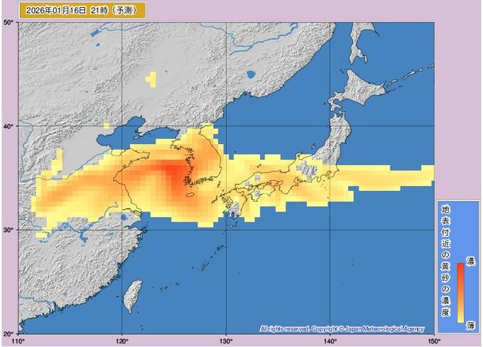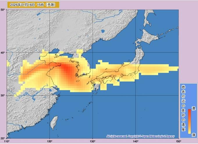 ニュースクリップ 【黄砂情報】16日から17日にかけて広範囲で飛来か…東シナ海から西日本、北日本も 洗濯物の外干しや外出時の対策に注意【黄砂シミュレーション】 2026年1月14日(水) 12:16 国内 暮らし・マネー 16日(金)黄砂解析予測シミュレーション 16日3時予想 16日9時予想 16日15時予想 16日21時予想