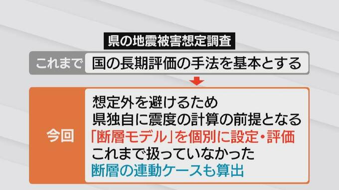 この調査を巡っては、これまで、国の長期評価の手法を基本としていましたが、今回は想定外を避けるため、県独自に震度の計算の前提となる「断層モデル」を個別に設定して評価。また、これまで扱っていなかった断層の連動ケースも算出しています。