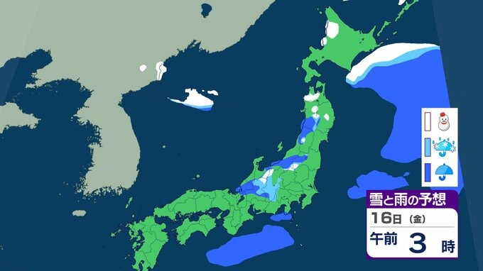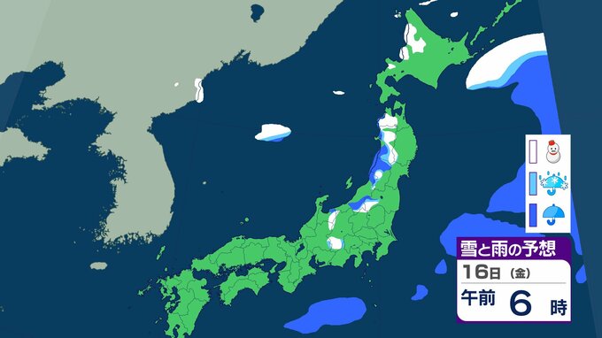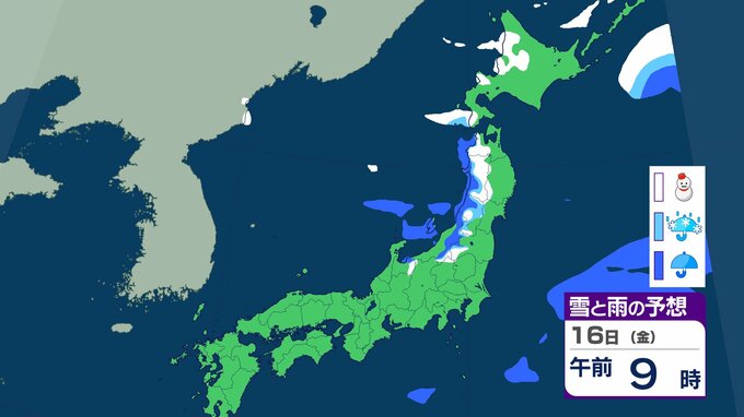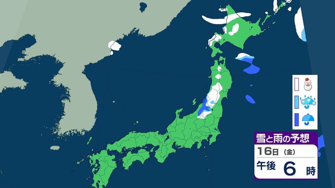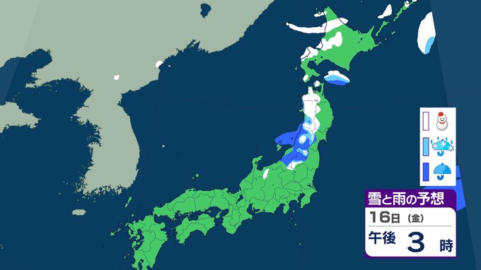 ニュースクリップ 【気象情報】15日は西日本から北日本で大気の状態が不安定…局地的な積乱雲の接近に警戒 落雷・竜巻・急な激しい雨…農作物のひょう被害にも対策を【雪と雨のシミュレーション】 2026年1月14日(水) 17:16 国内 天気 16日(金)の雨と雪のシミュレーション
