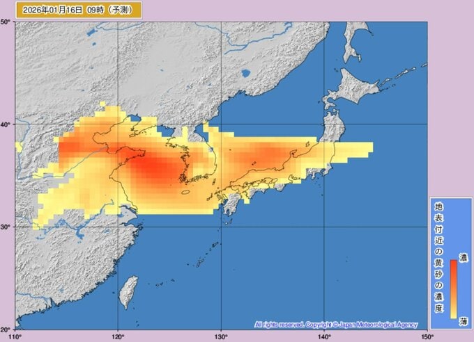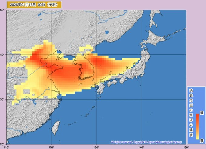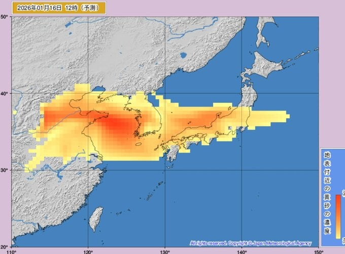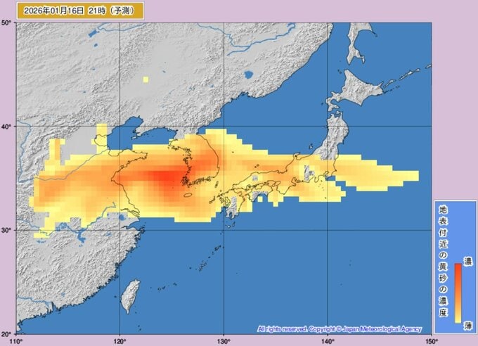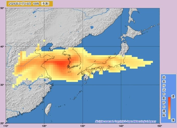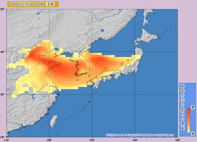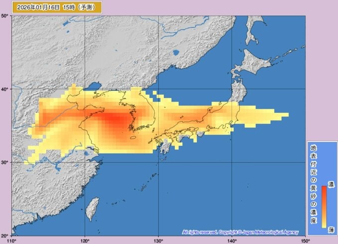 ニュースクリップ 【黄砂】16日未明に西日本に到達か、午後には東日本や東北でも濃度上昇へ 17日にかけて太平洋側にも拡大か 視程悪化や健康管理に注意【黄砂解析シミュレーション】 2026年1月15日(木) 13:00 国内 天気 16日(金)黄砂の動きシミュレーション