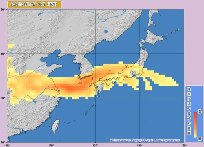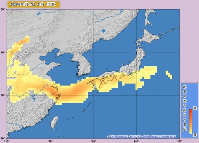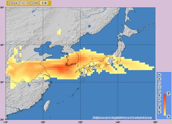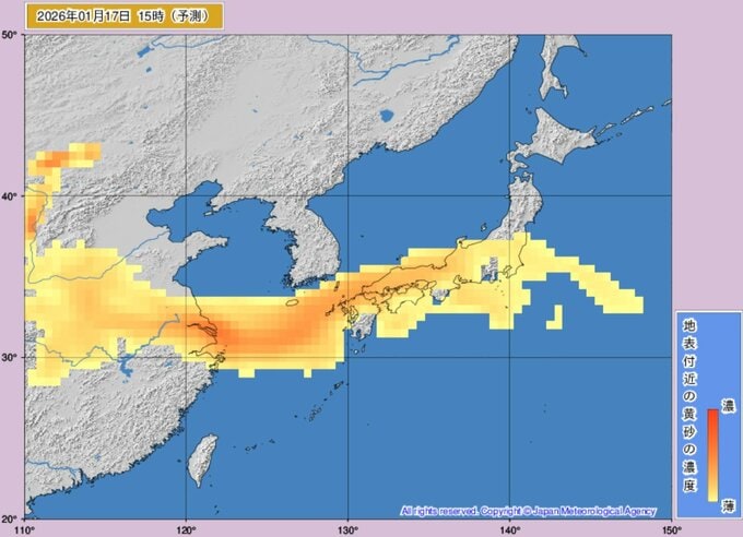 ニュースクリップ 【黄砂】16日未明に西日本に到達か、午後には東日本や東北でも濃度上昇へ 17日にかけて太平洋側にも拡大か 視程悪化や健康管理に注意【黄砂解析シミュレーション】 2026年1月15日(木) 13:00 国内 天気 17日(土)黄砂の動きシミュレーション