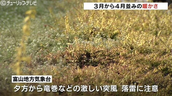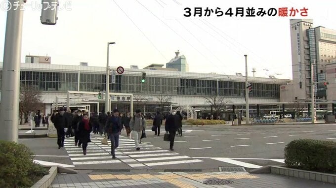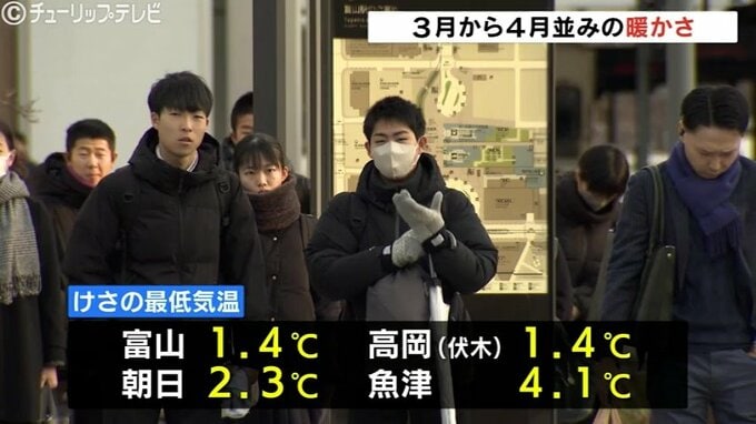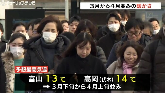 この後も気温は上がり最高気温は富山で13℃高岡市の伏木は14℃ときのう(14日)より8℃ほど上がり3月下旬から4月上旬並みになる予想です。