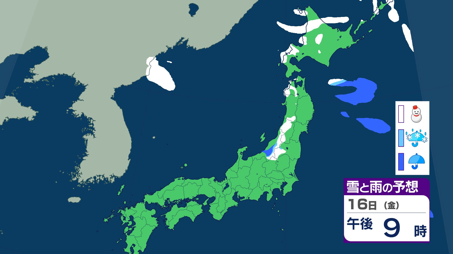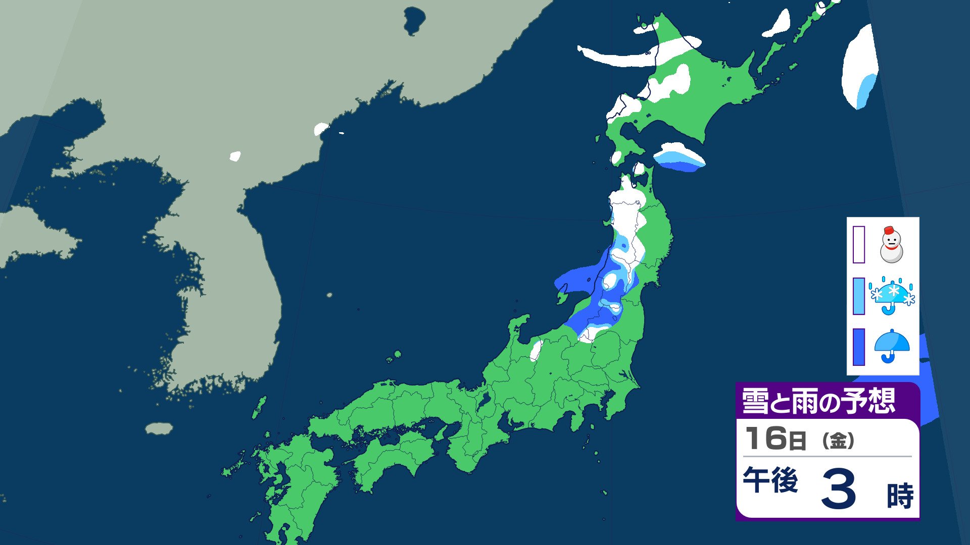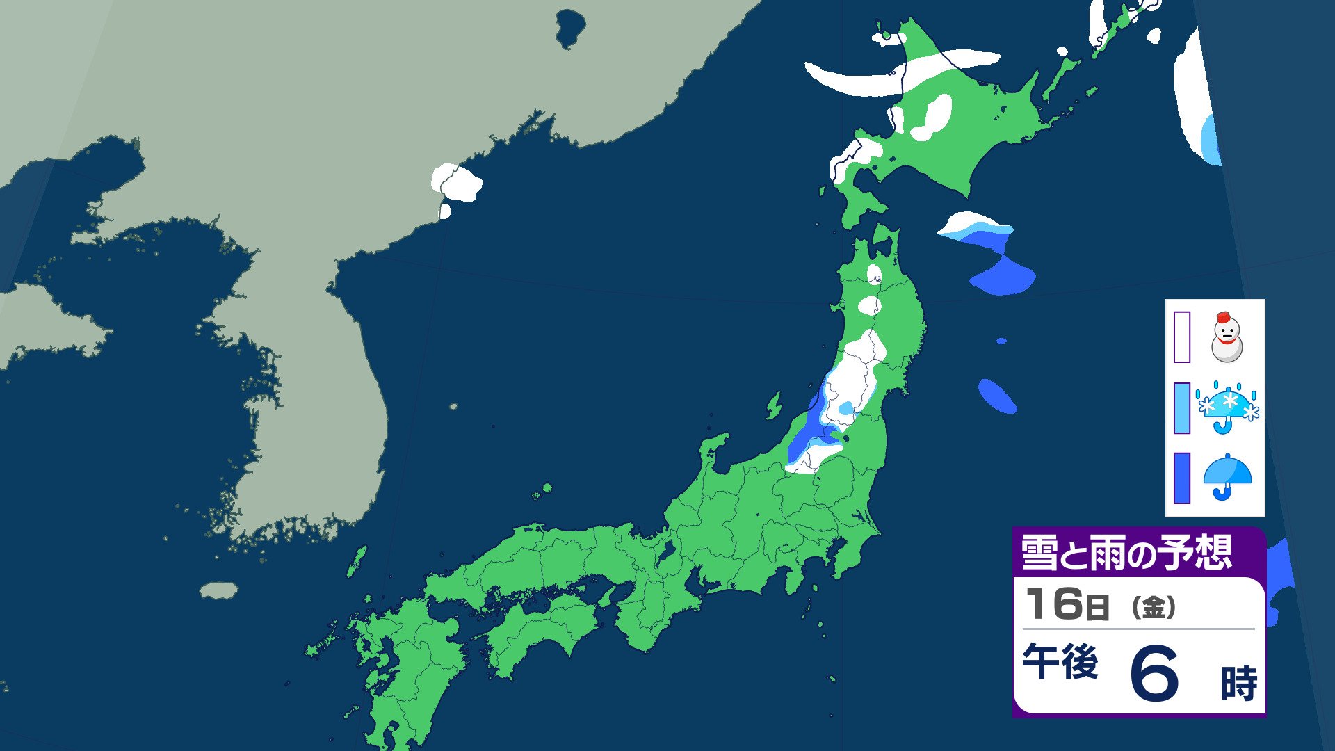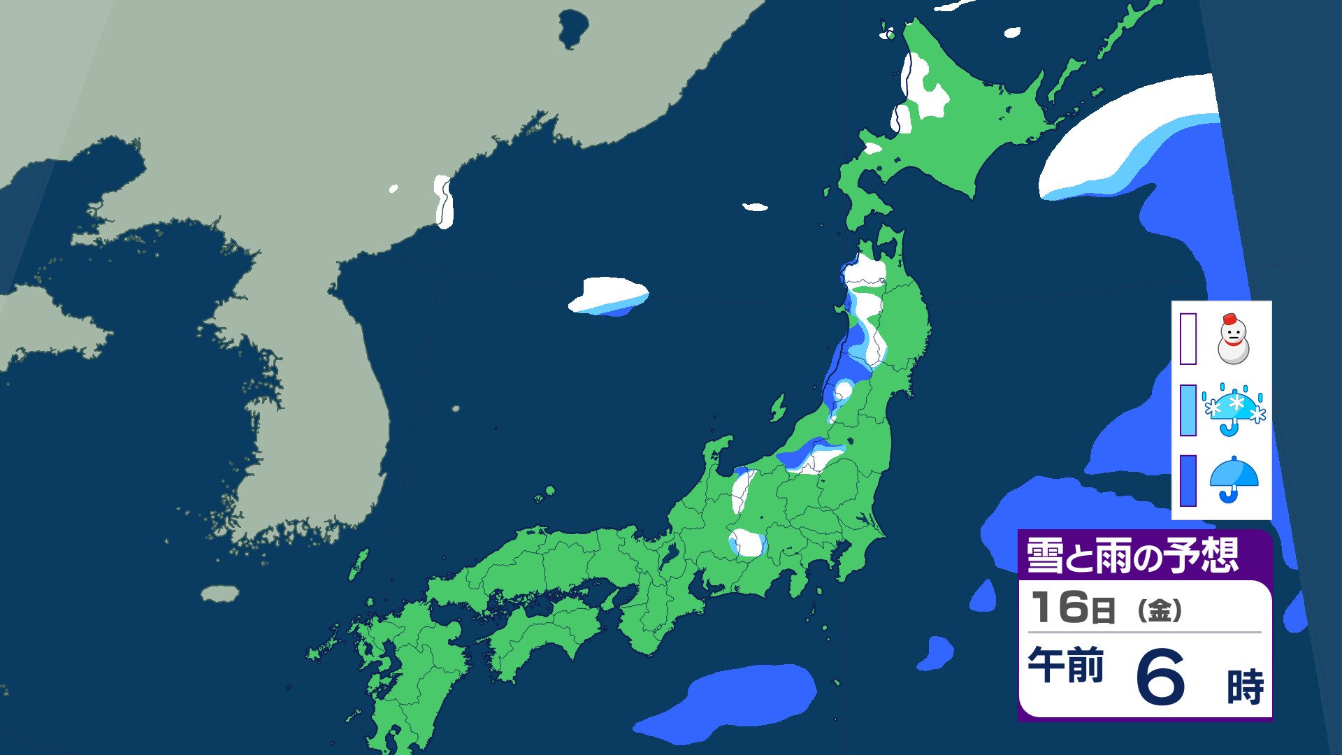 ニュースクリップ 21日ごろから…この時期としては“10年に1度”レベル 著しい低温の可能性 北海道・東北・関東甲信・東海・北陸・東海・近畿・四国・中国・九州北部・九州南部・沖縄に 早期天候情報 2026年1月16日(金) 07:07 国内 天気 16日(金)の雨と雪のシミュレーション