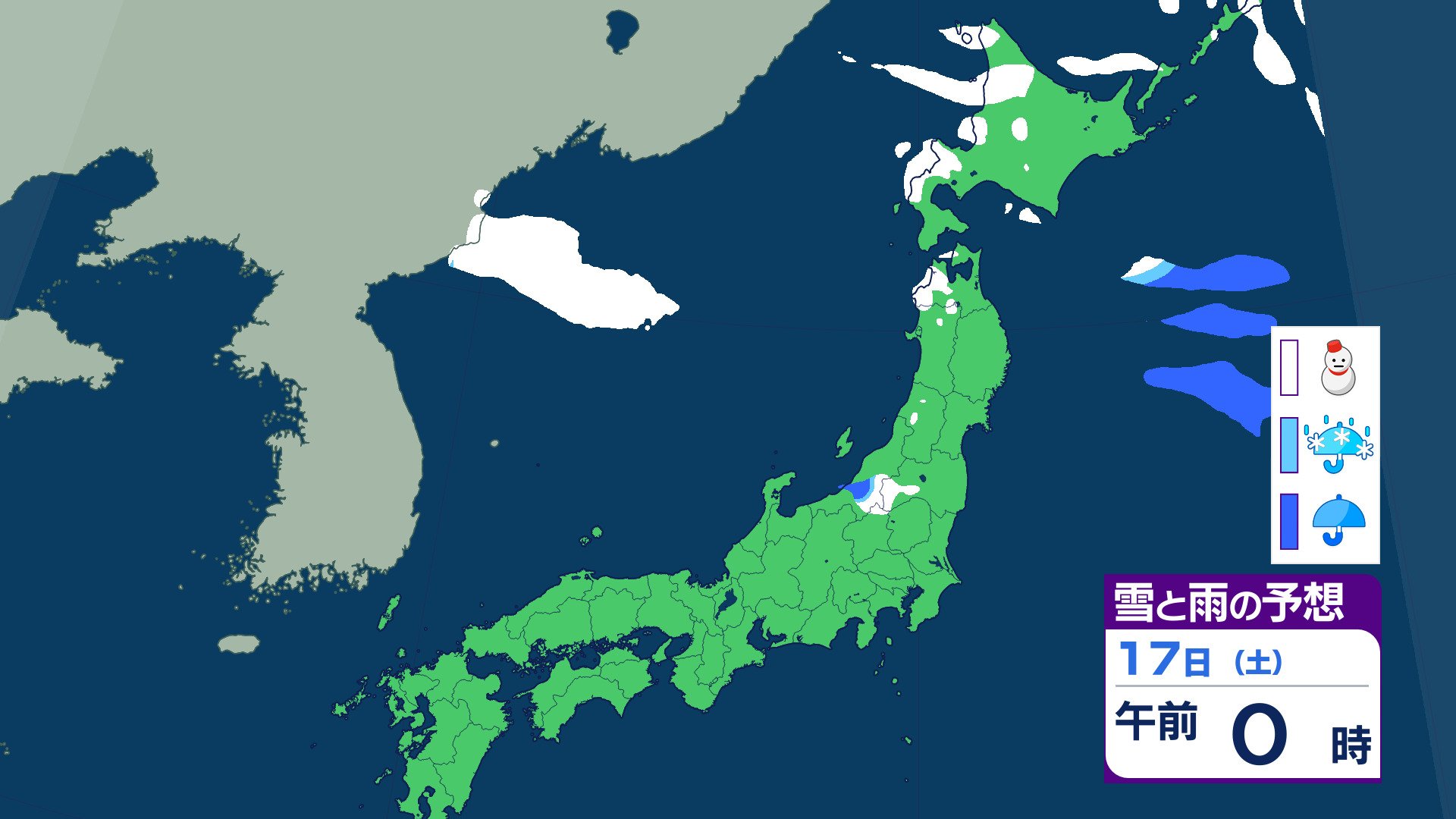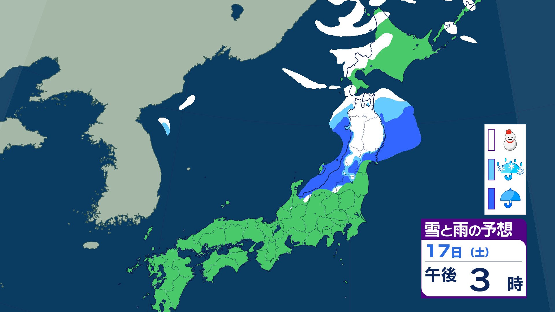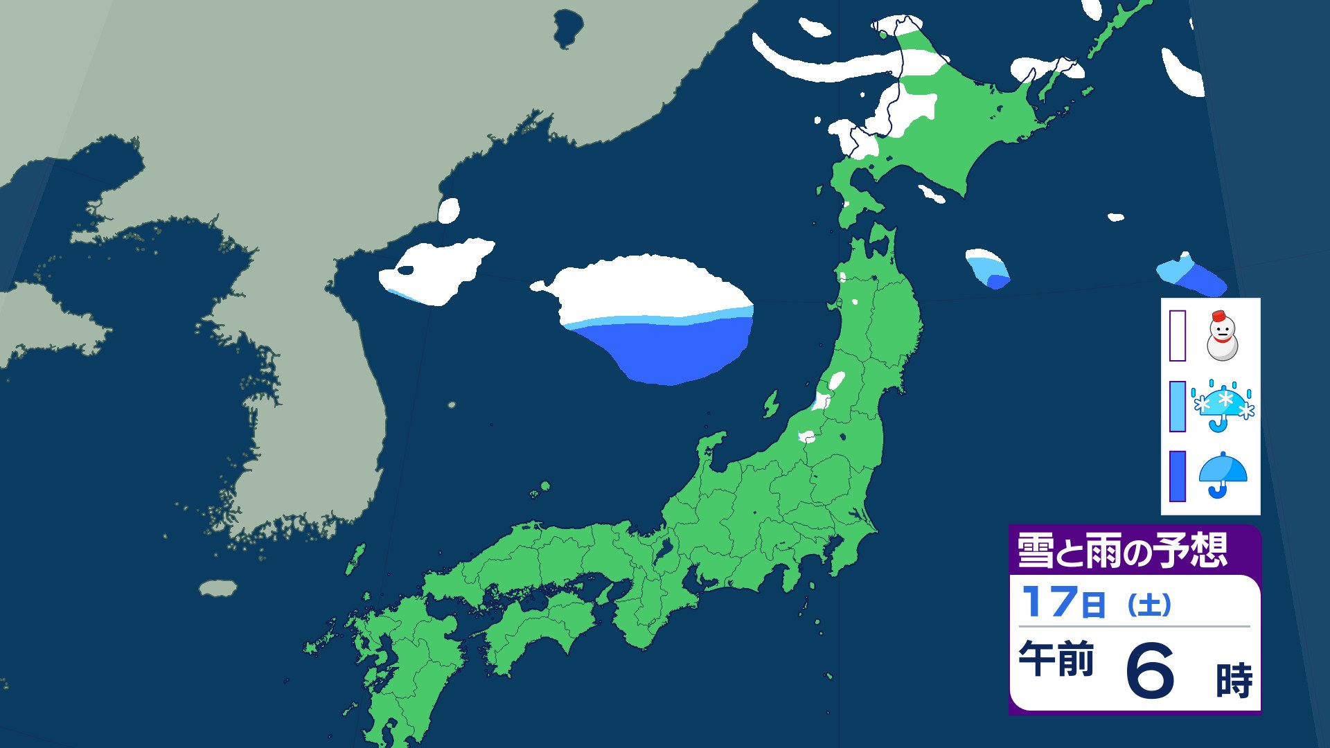 ニュースクリップ 21日ごろから…この時期としては“10年に1度”レベル 著しい低温の可能性 北海道・東北・関東甲信・東海・北陸・東海・近畿・四国・中国・九州北部・九州南部・沖縄に 早期天候情報 2026年1月16日(金) 07:07 国内 天気 17日(土)の雨と雪のシミュレーション