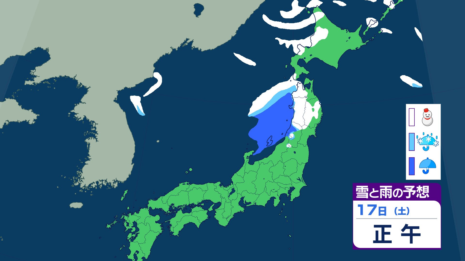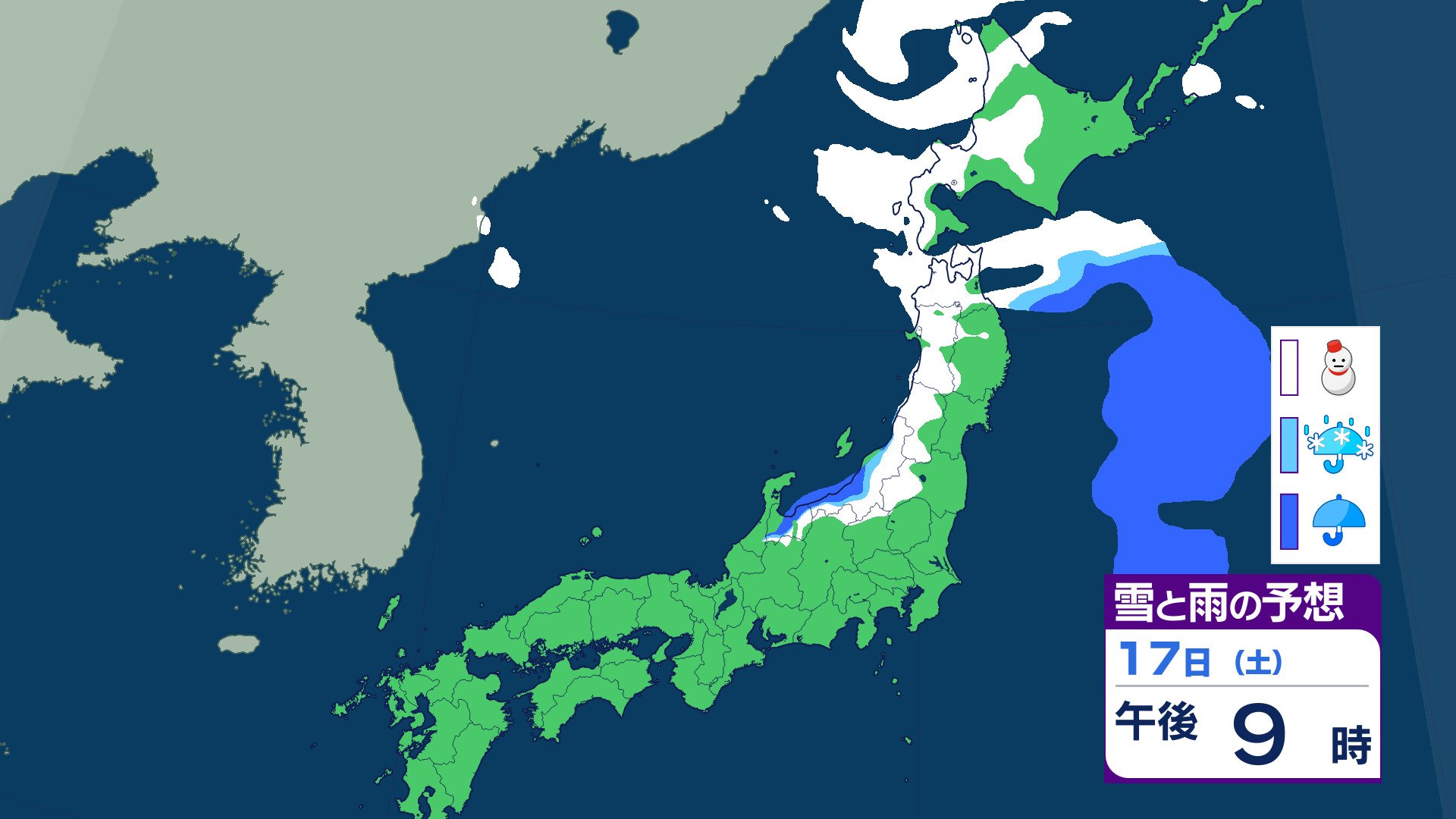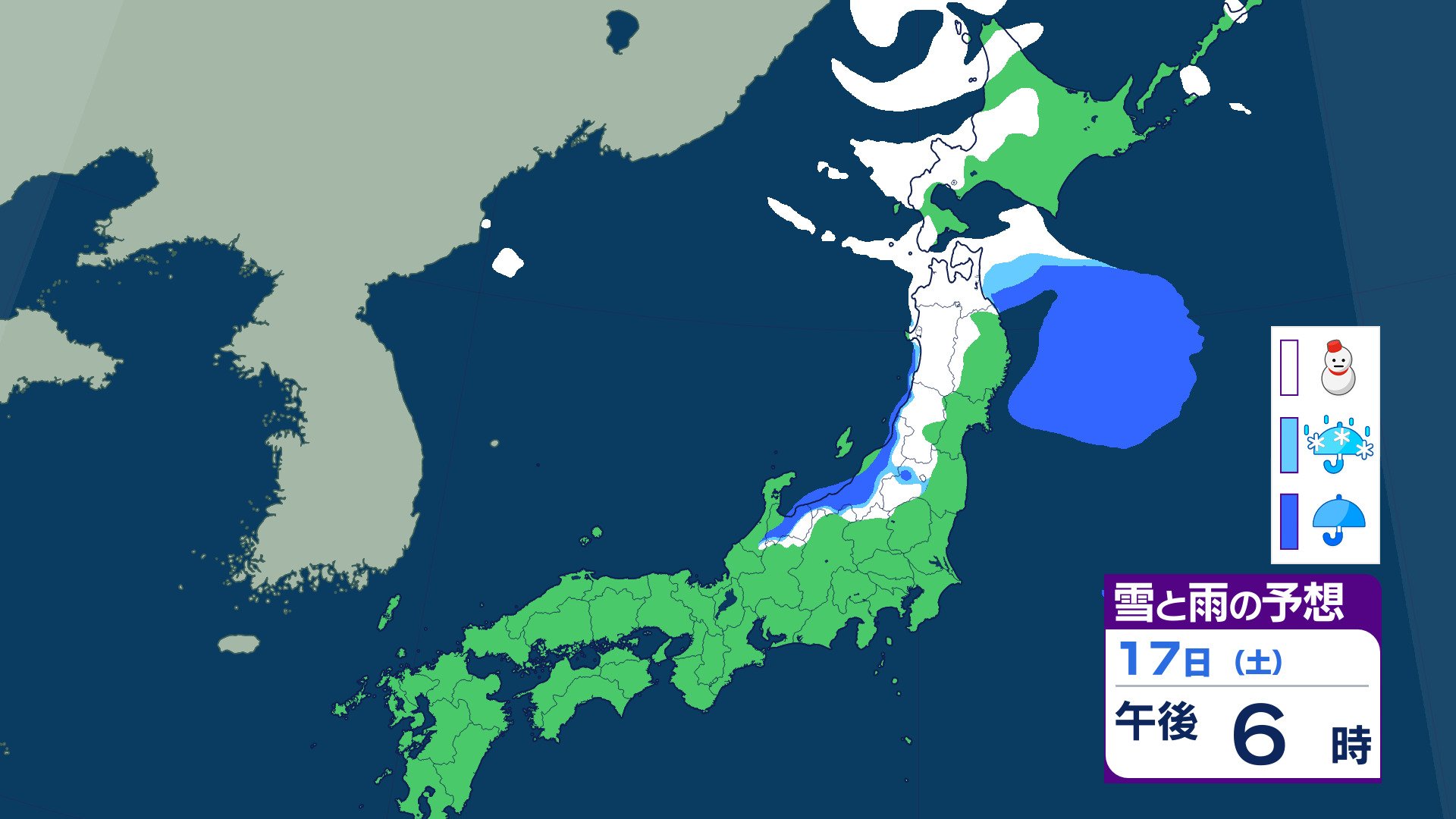 ニュースクリップ 21日ごろから…この時期としては“10年に1度”レベル 著しい低温の可能性 北海道・東北・関東甲信・東海・北陸・東海・近畿・四国・中国・九州北部・九州南部・沖縄に 早期天候情報 2026年1月16日(金) 07:07 国内 天気 17日(土)の雨と雪のシミュレーション