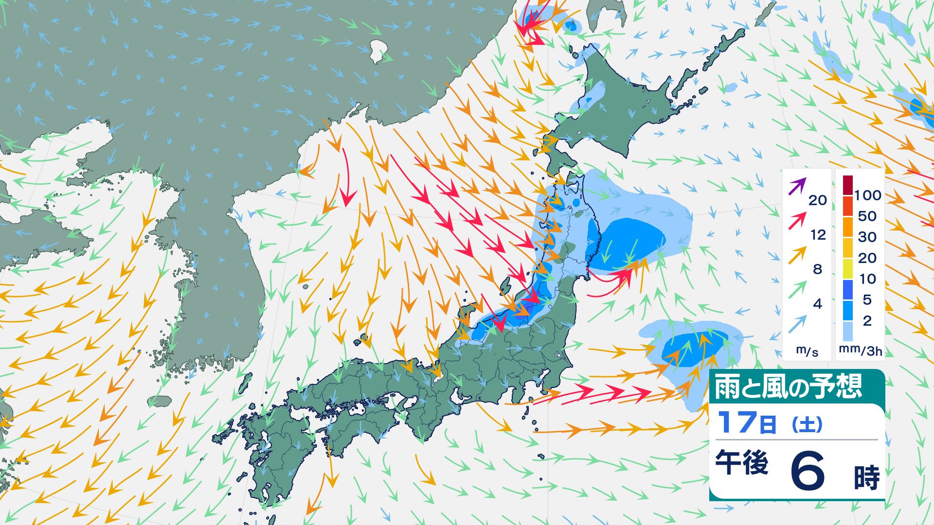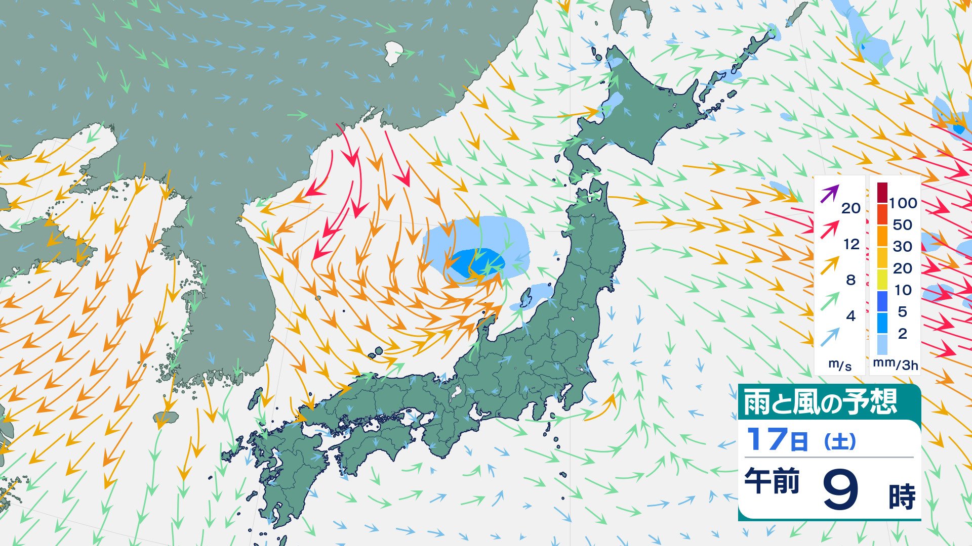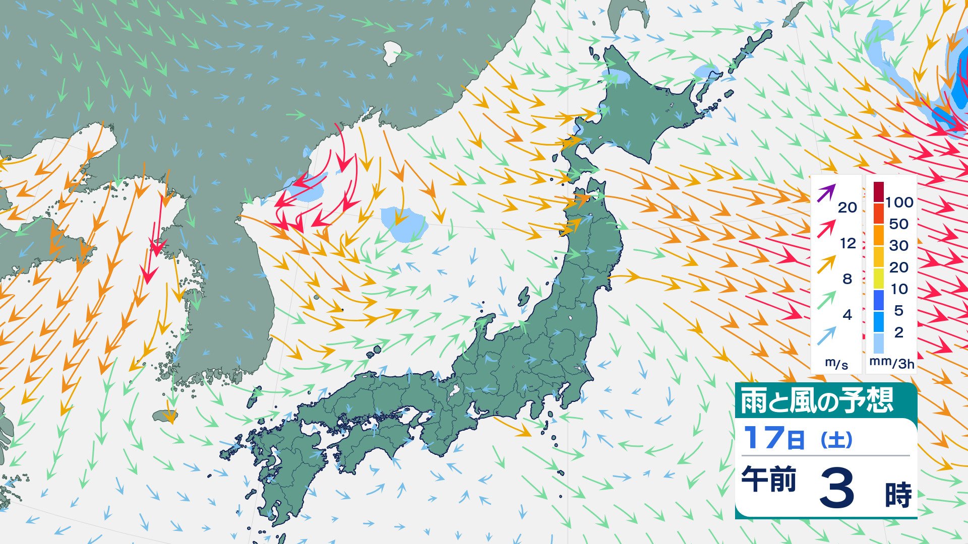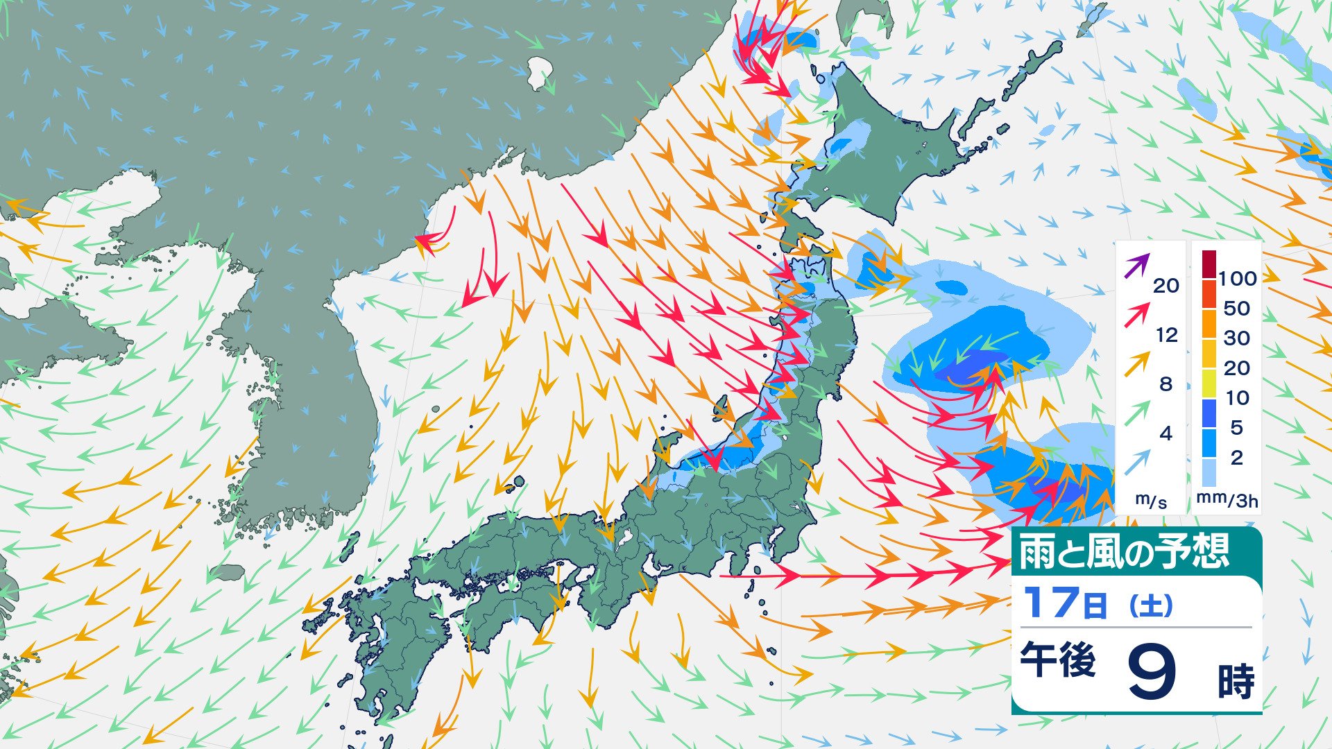 ニュースクリップ 北・東日本で落雷や激しい突風に注意 北陸など土砂災害に警戒 東北は30cm降雪予想 16日にかけ大気不安定に【雨と風のシミュレーション】 2026年1月15日(木) 21:28 国内 17日(土)の雨と雪のシミュレーション
