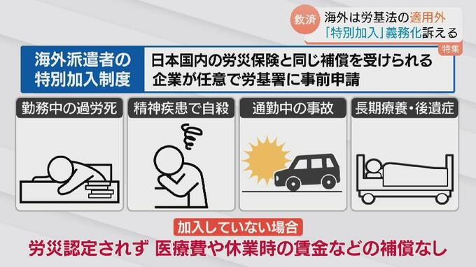 厚生労働省によりますと、2024年3月末の時点で海外派遣の特別加入者は8万人余りですが、外務省の調べでは3か月以上の長期で滞在する海外派遣者は71万人余りと、多くの人が補償の対象外とみられます。