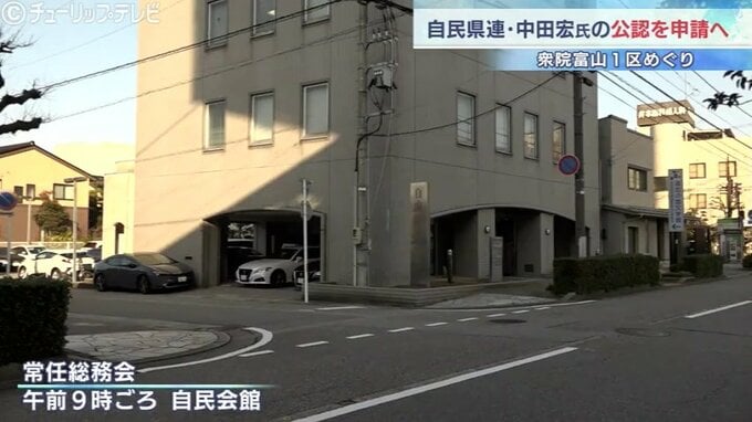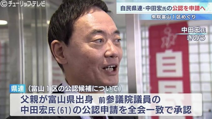 会では1区の自民党公認候補について協議が行われ、父親が富山県出身で、前参議院議員である中田宏氏の公認申請を全会一致で承認したということです。