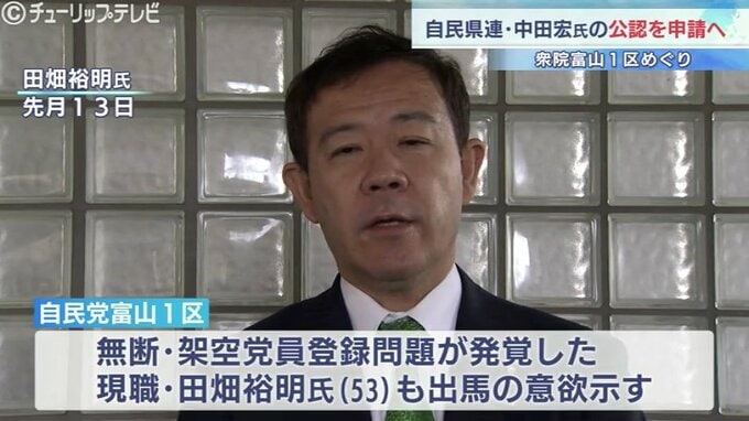 自民党富山1区をめぐっては、無断・架空党員登録問題が発覚した現職の田畑裕明氏も出馬の意欲を示しています。