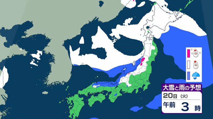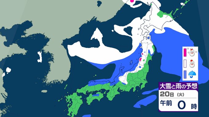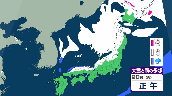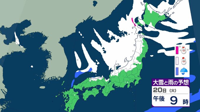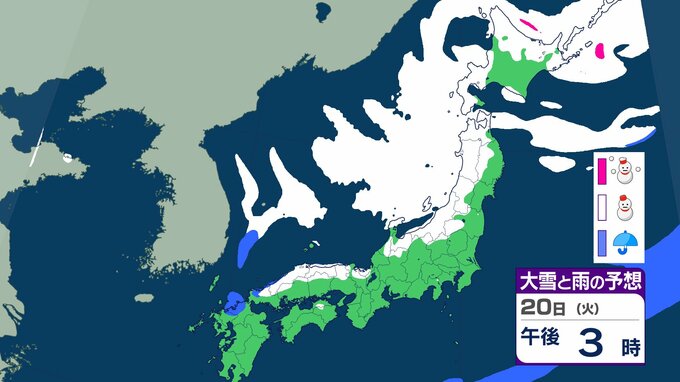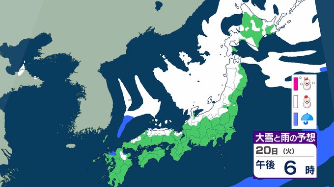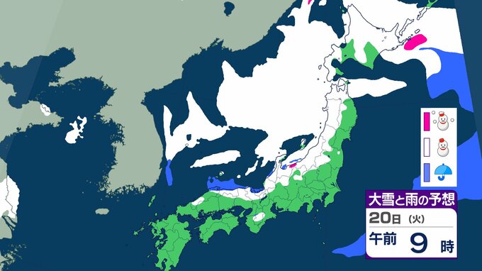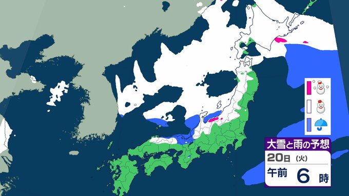 ニュースクリップ 21日から25日ごろ 北日本~西日本の日本海側中心に大雪のおそれ 雪雲停滞で“警報級”の可能性も 【雨と雪のシミュレーション】 2026年1月18日(日) 15:47 国内 天気 20日(日)の雨と雪のシミュレーション