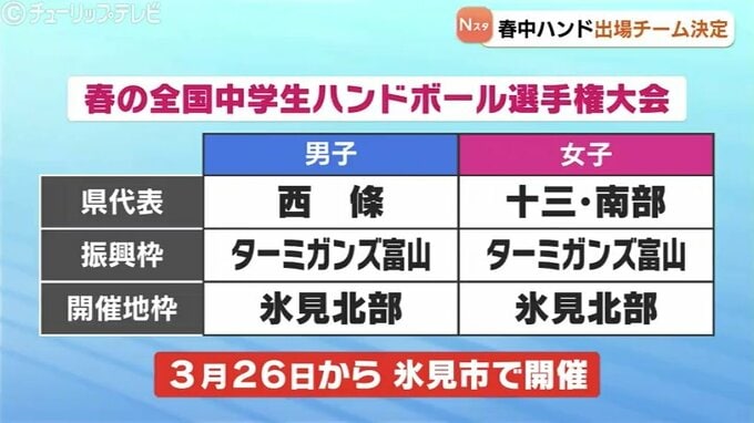 3月下旬に氷見市で開催される「春の全国中学生ハンドボール選手権大会」、通称「春中ハンド」の県代表決定戦が行われ、富山から出場する全6チームが出そろいました。