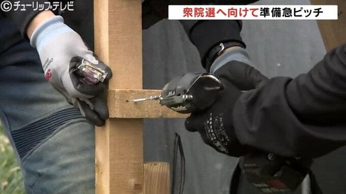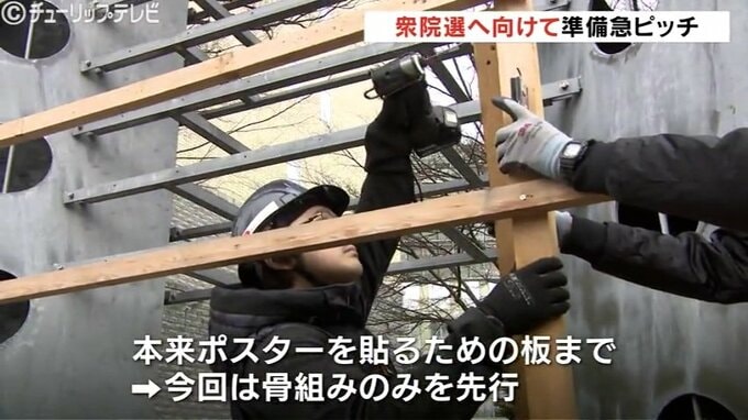 今回は解散表明から公示日まで時間がないことが予想されるため本来は、ポスターを貼るための「板」まで一度に取り付けるところを、資材の調達が間に合わず、「骨組みのみ」を先行して設置する対応がとられました。