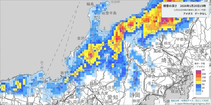 気象庁によりますと、日本付近は21日から25日頃にかけて強い冬型の気圧配置となり、東海地方の上空約1500メートルには氷点下9度以下の強い寒気が流れ込む見込みです。このため、岐阜県では21日から25日頃にかけて山地を中心に平地でも大雪となる所があるでしょう。雪雲が予想以上に発達した場合や、同じ所に雪雲が流れ込み続けた場合には、警報級の大雪となる可能性があります。