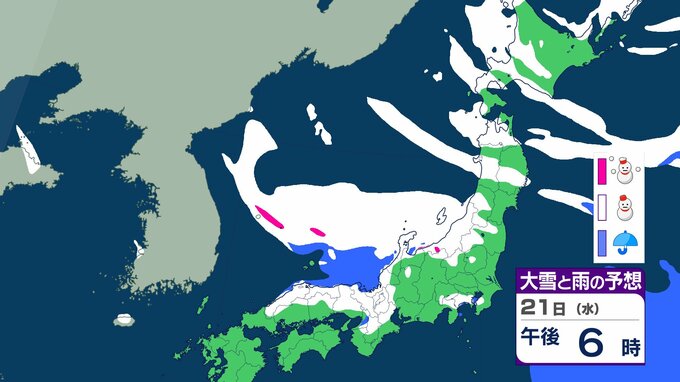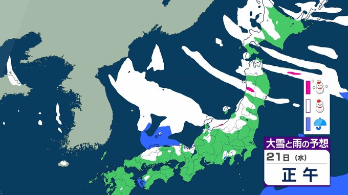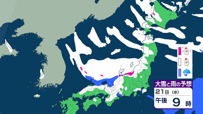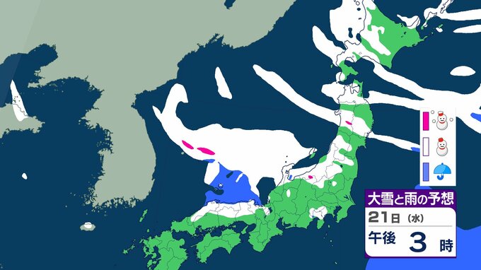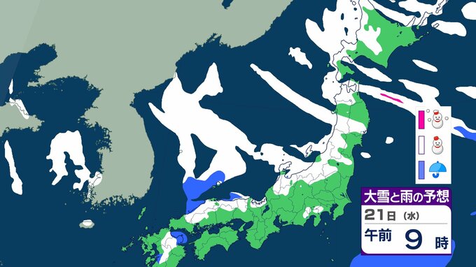 ニュースクリップ 【大雪情報】北陸・近畿・中国 22日にかけて大雪に警戒 最大で80cm降雪予想 太平洋側で大雪になるところも 【雪と雨のシミュレーション】 2026年1月21日(水) 09:22 国内 天気 21日(水)の雨と雪のシミュレーション