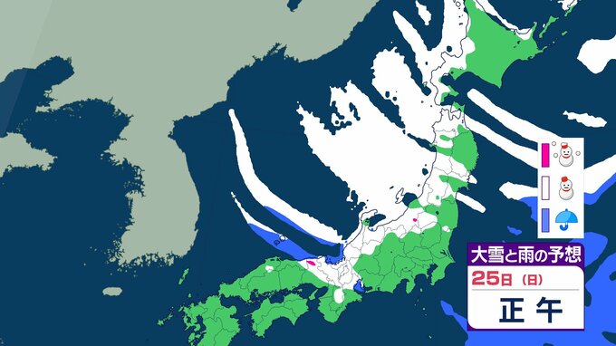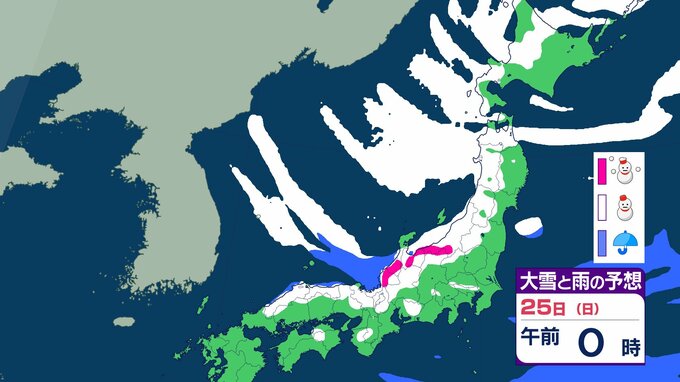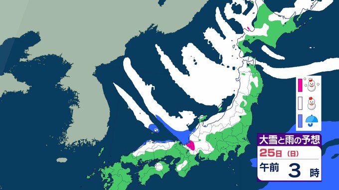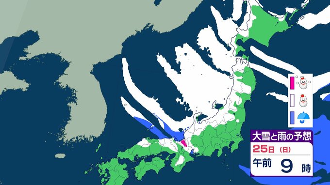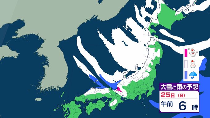 ニュースクリップ 【大雪情報】北陸・近畿・中国 22日にかけて大雪に警戒 最大で80cm降雪予想 太平洋側で大雪になるところも 【雪と雨のシミュレーション】 2026年1月21日(水) 09:22 国内 天気 25日(日)の雨と雪のシミュレーション
