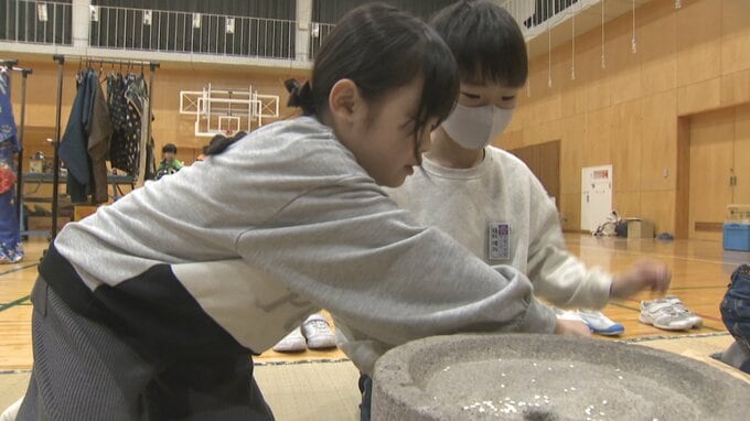 子どもたちは実際に石臼でコメを挽いたり、ハンカチに炭火アイロンをかけたりして、当時の暮らしの苦労や知恵に驚き、そして、理解を深めていました。