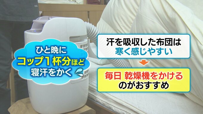 寝ている間、人間はコップ1杯分の汗をかいているといいます。これだけの汗を吸収した布団は寒く感じやすいので、毎日、乾燥機をかけて布団をカラカラに乾かすのがおすすめということでした。