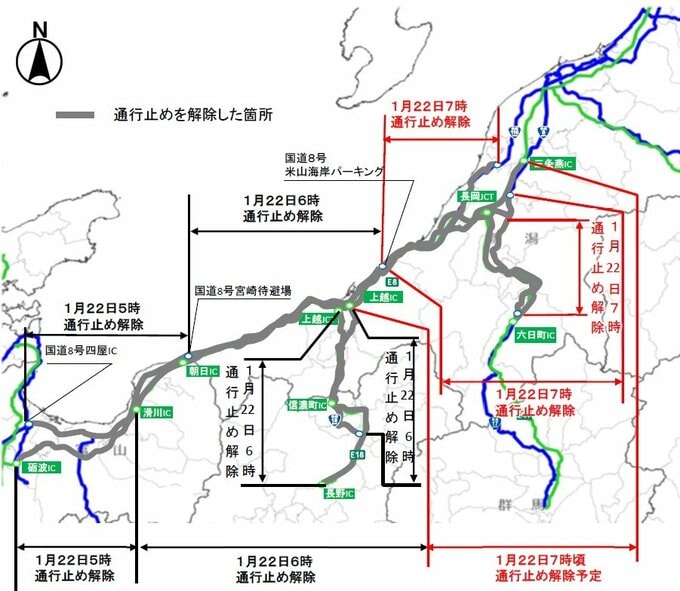 また、22日(木)午前6時には北陸道(滑川IC~上越IC)、上信越道、国道8号(富山県朝日町~新潟県柏崎市米山町)、国道18号の通行止めが解除済みとなっています。