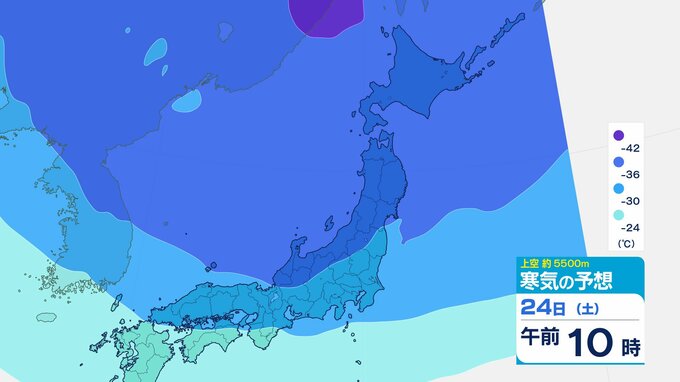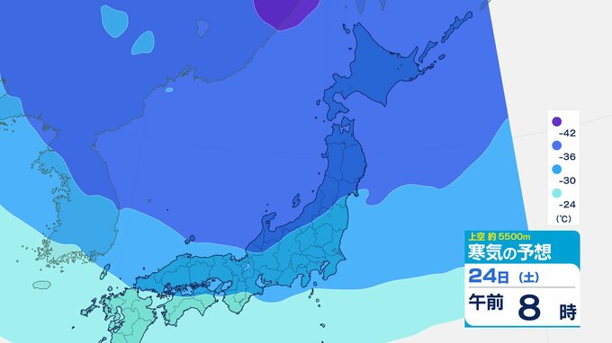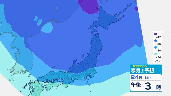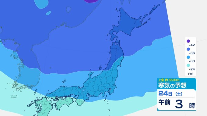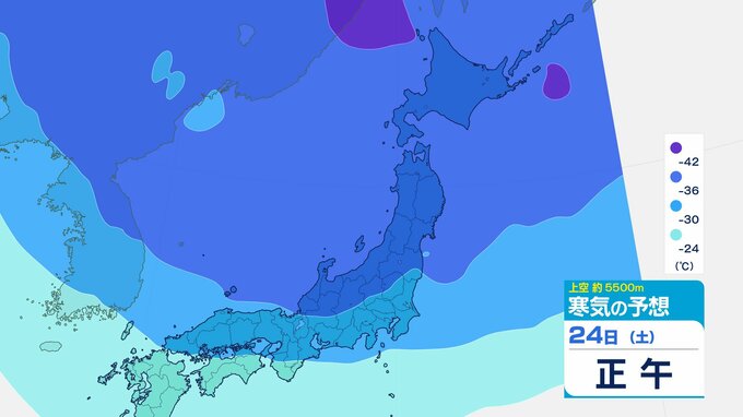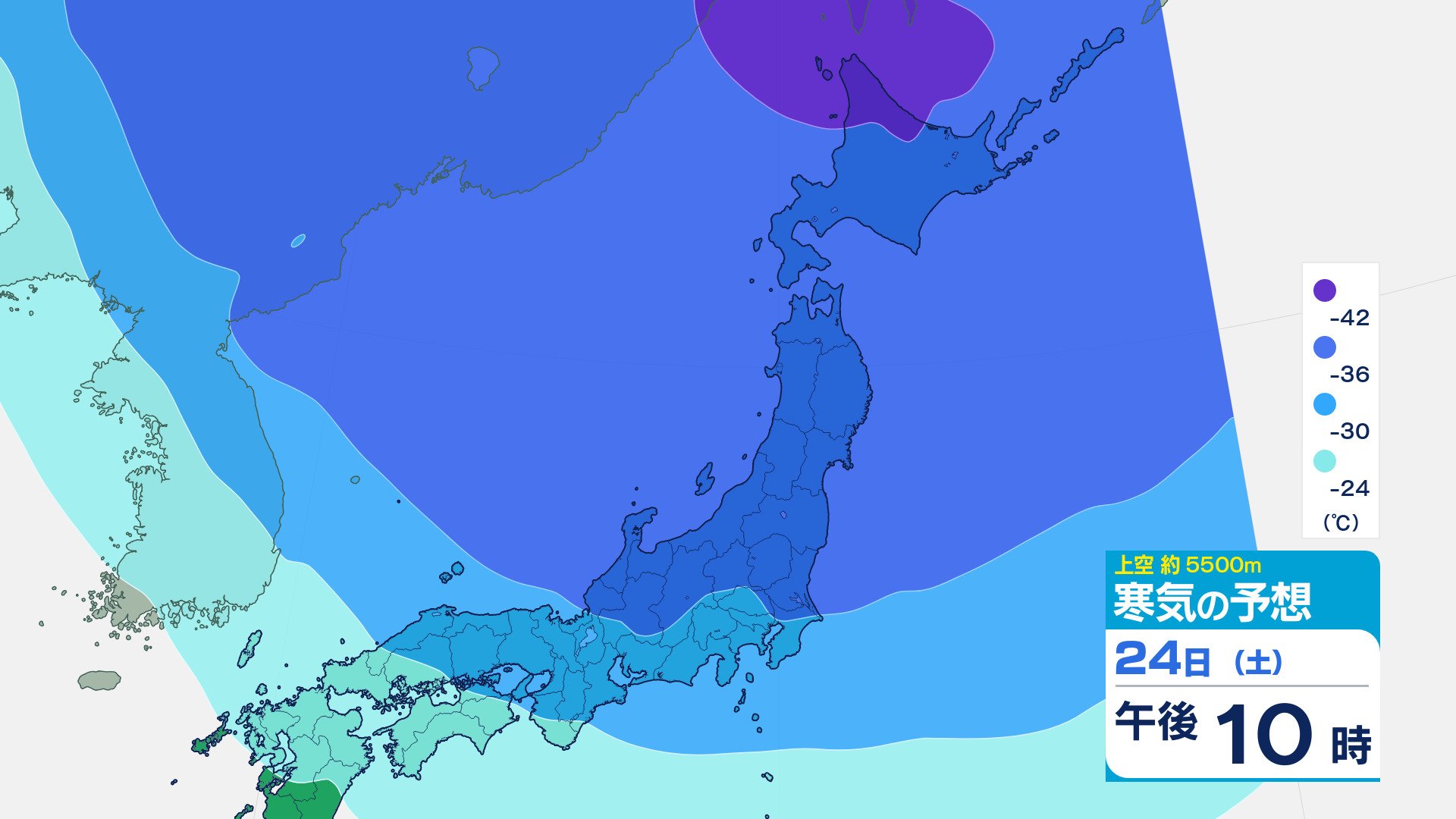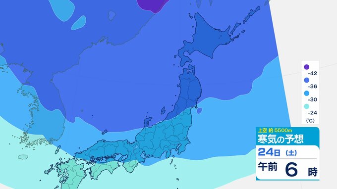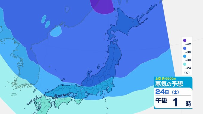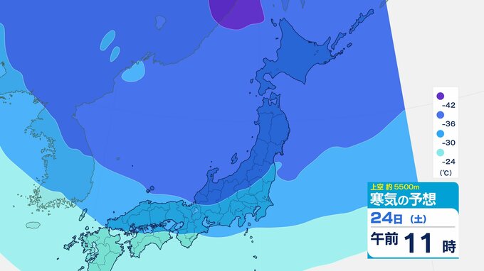ニュースクリップ 【寒波いつまで?】岐阜県の山地で最大70センチ予想 東海地方は25日頃まで強い冬型続く 愛知・三重も積雪や凍結による交通障害に注意【上空の寒気シミュレーション】 2026年1月22日(木) 15:50 国内 天気 24日(土)寒気の動きシミュレーション
