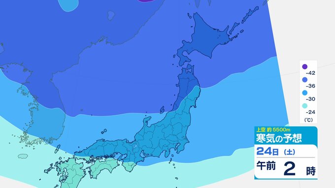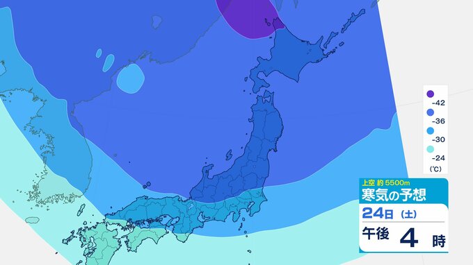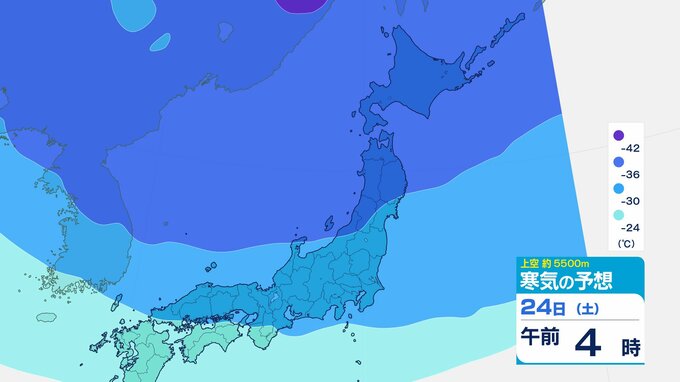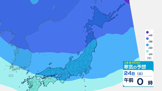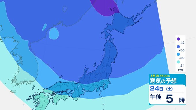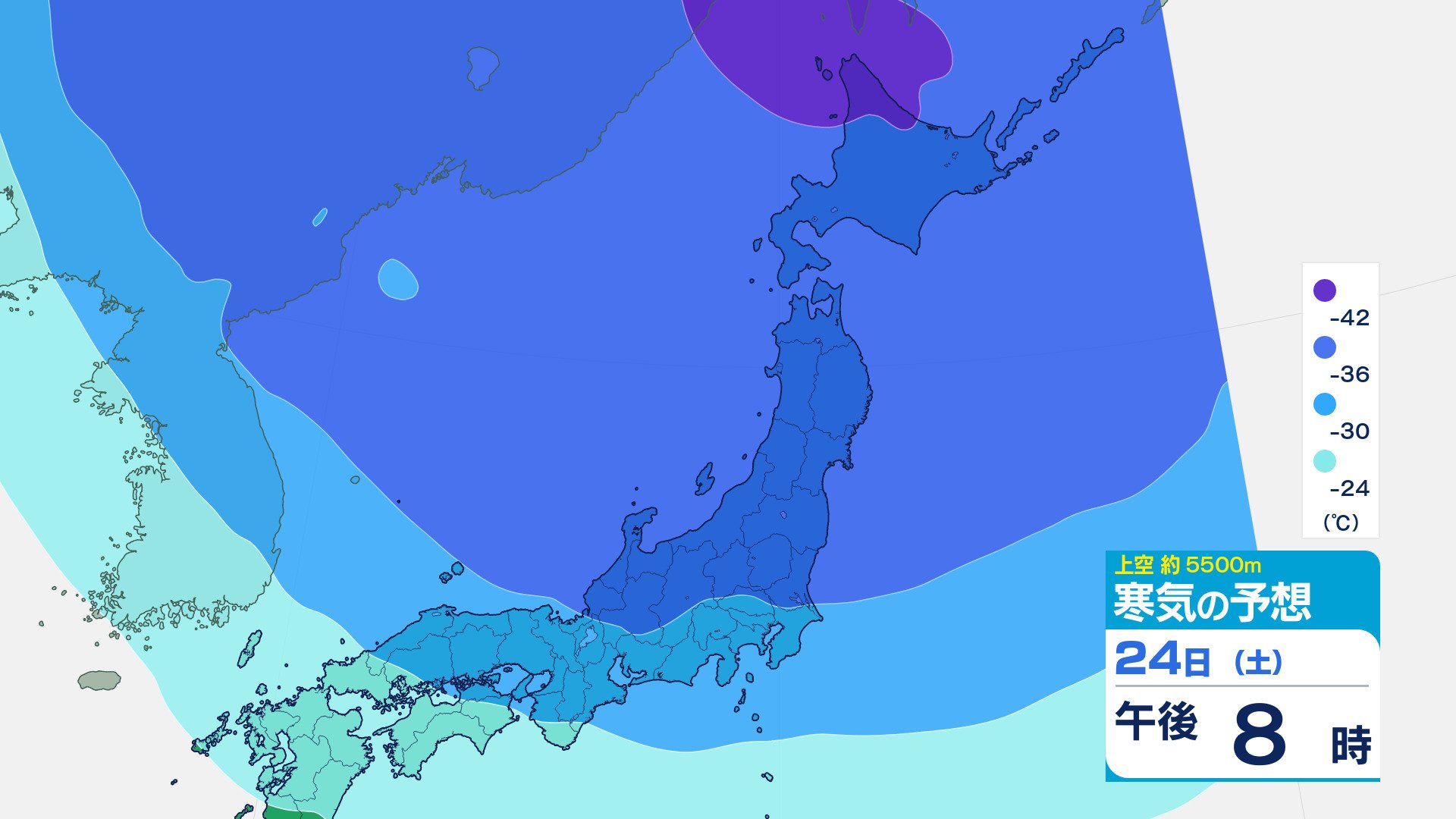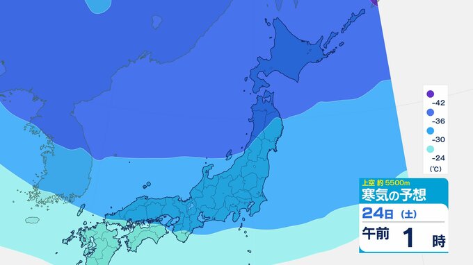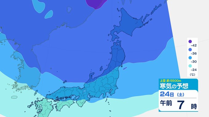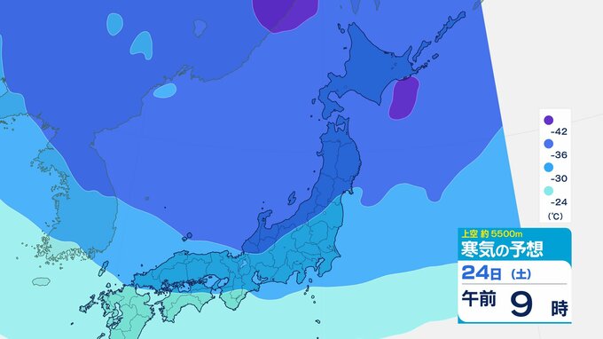 ニュースクリップ 【寒波いつまで?】岐阜県の山地で最大70センチ予想 東海地方は25日頃まで強い冬型続く 愛知・三重も積雪や凍結による交通障害に注意【上空の寒気シミュレーション】 2026年1月22日(木) 15:50 国内 天気 24日(土)寒気の動きシミュレーション