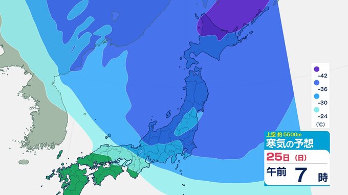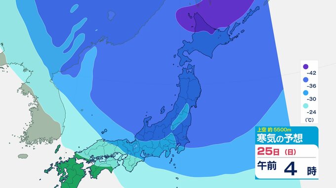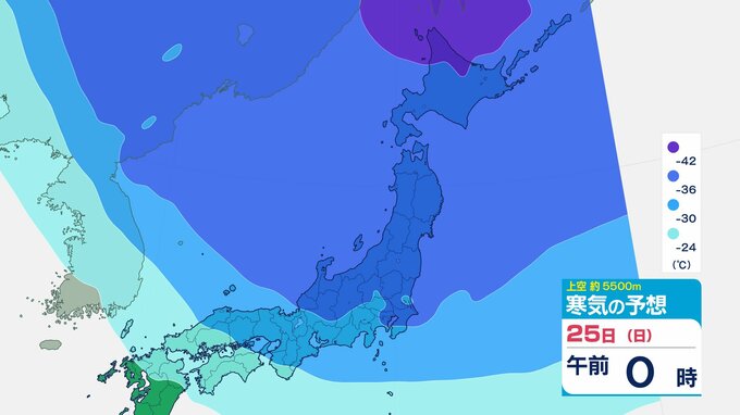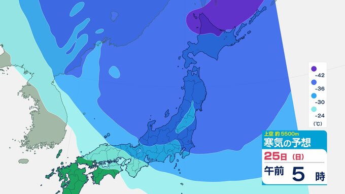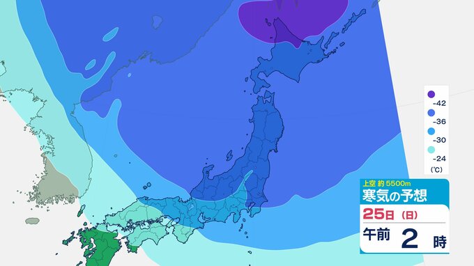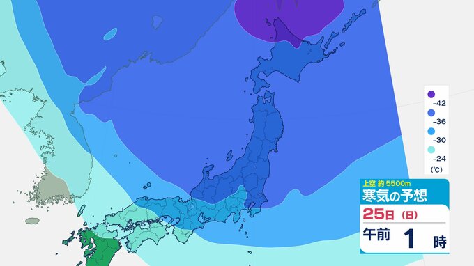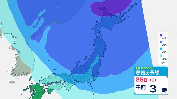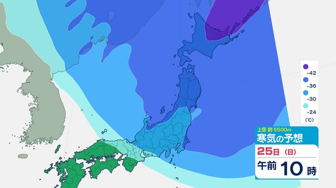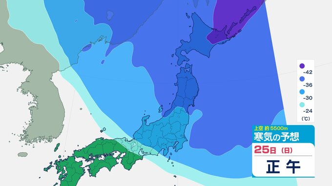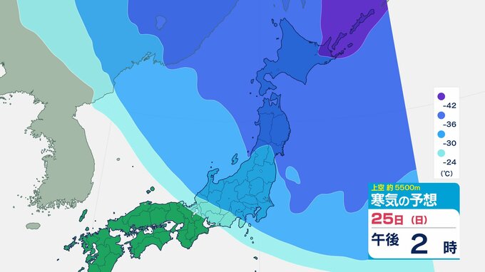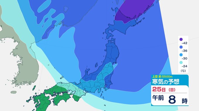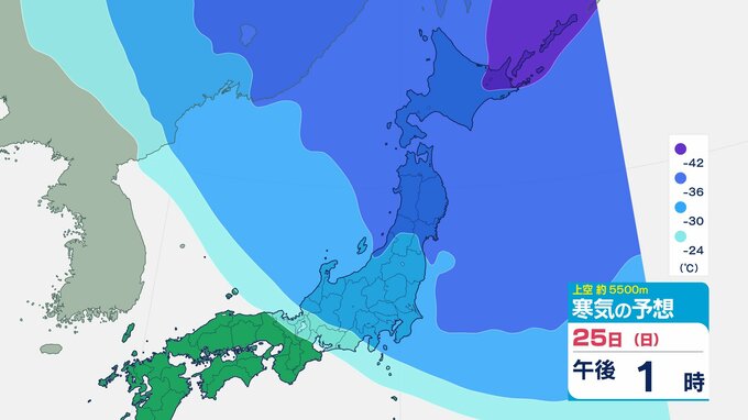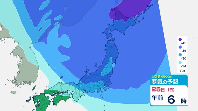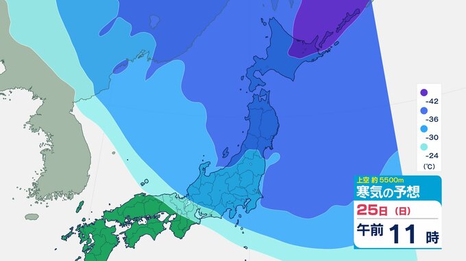 ニュースクリップ 【寒波いつまで?】岐阜県の山地で最大70センチ予想 東海地方は25日頃まで強い冬型続く 愛知・三重も積雪や凍結による交通障害に注意【上空の寒気シミュレーション】 2026年1月22日(木) 15:50 国内 天気 25日(日)寒気の動きシミュレーション