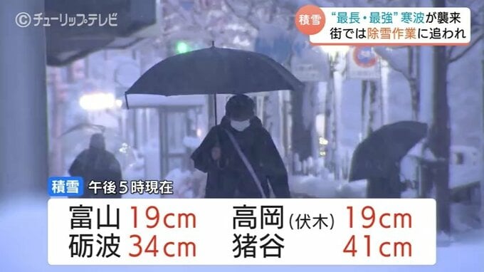 北陸地方の上空に強い寒気が流れ込んだ影響で、富山県内は21日夜から断続的に雪が降りました。午後5時時点の積雪は、富山、高岡市の伏木ともに19センチ、砺波で34センチなどとなっています。