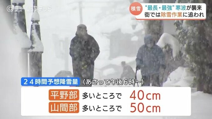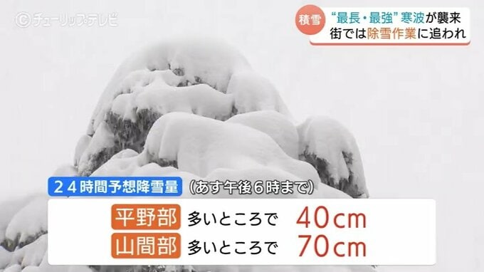 雪は25日にかけて降り続く見込みで、23日午後6時までに予想される24時間降雪量は、東部・西部ともに多いところで平野部で40センチ、山間部で70センチ、24日午後6時からは平野部で40センチ、山間部で50センチとなっています。