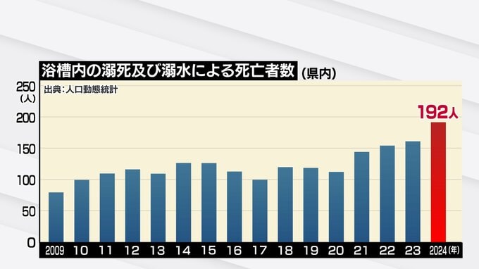 厚生労働省の調査によりますと、県内でヒートショックなどが原因で入浴中に毎年100人以上の人が亡くなっていて、2024年は192人。