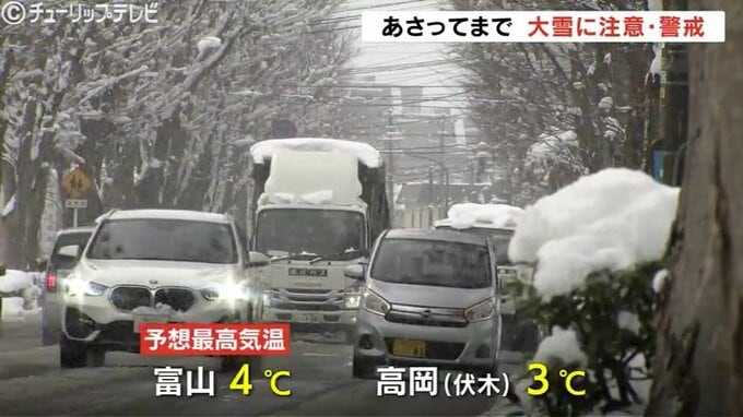 この冬、もっとも強い寒波の影響で、富山県内は断続的に雪が降っています。気象台はあさってまで大雪による交通障害などに注意・警戒を呼びかけています。