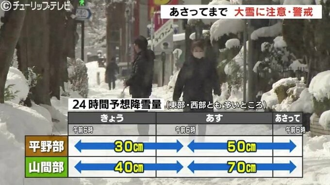 ただ強い冬型の気圧配置はあさって25日まで続く見込みで予想される24時間降雪量は、東部西部ともに多いところであす朝6時までが平野部で30センチ、山間部で40センチ、あさっての朝6時までが平野部で50センチ、山間部で70センチです。