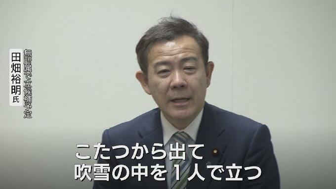 田畑裕明氏「確かに私は失敗をしました。しかし真摯に反省をし、いろんな方にまた認めていただくべく努力をしてきたつもりでありまして」「こたつから出て、吹雪の中を1人で立つ。そのような気持ちで田畑裕明の名を浸透させていきたい」