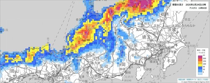 24日15時現在の24時間降雪量(アメダスによる速報値)