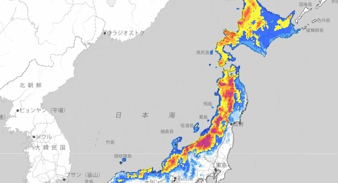 24日午後6時から25日午後6時までに予想される24時間降雪量は多い所で、