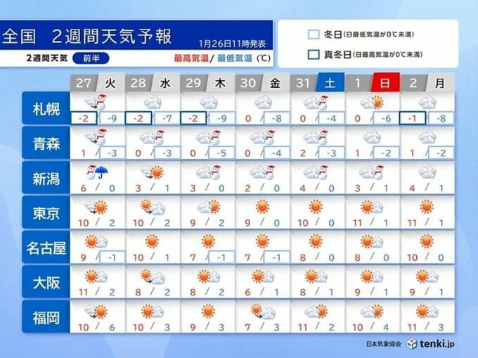 北日本から東日本では28日(水)にかけて、大雪による交通障害や着雪に注意が必要です。北日本から西日本の積雪の多い傾斜地ではなだれに警戒してください。