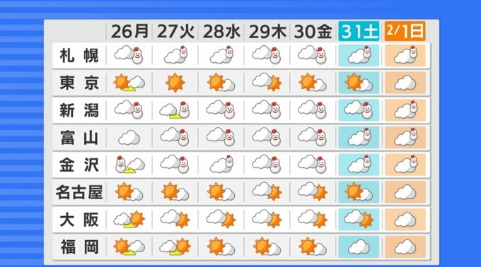 週間予報をみていくと、31日(土)は、高気圧が日本の南へ移動して冬型の気圧配置は緩むものの、低気圧が東シナ海へ進むでしょう。