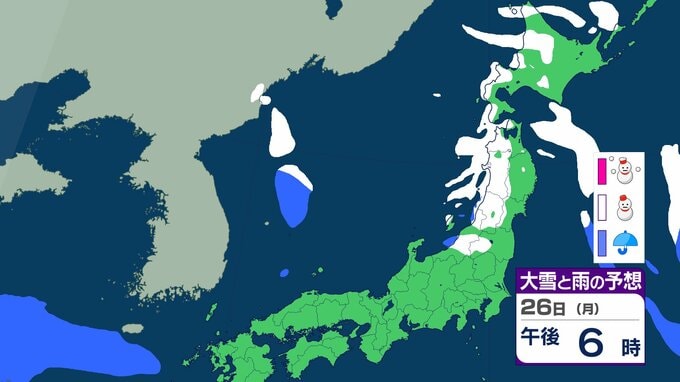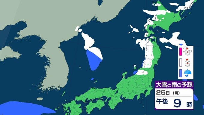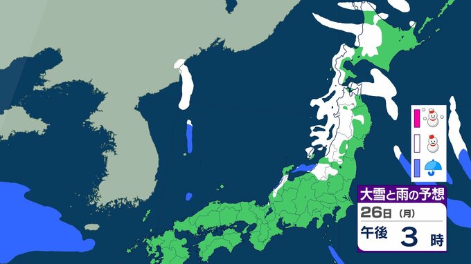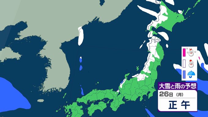 ニュースクリップ 【週間予報】29日(木)から再び強い冬型の気圧配置へ 日本海側は再び “警報級大雪” の可能性も…31日(土)は緩むも2月1日(日)は雨や雪へ【雪と雨のシミュレーション】 2026年1月26日(月) 11:30 国内 天気 26日(月)の雨と雪のシミュレーション