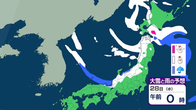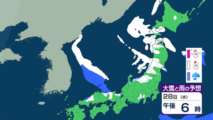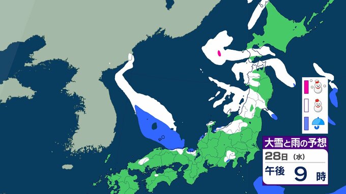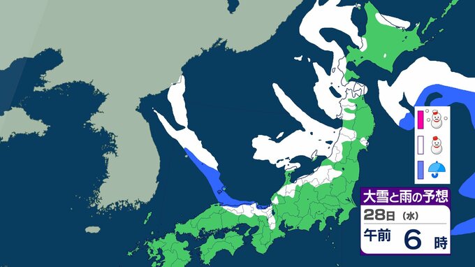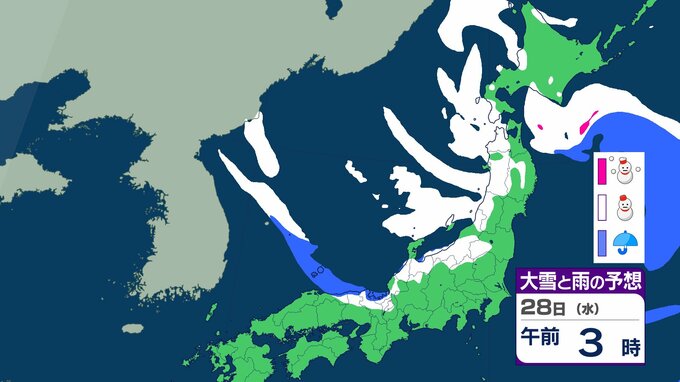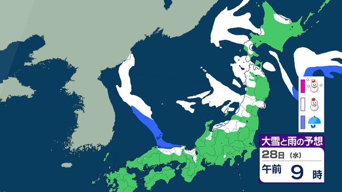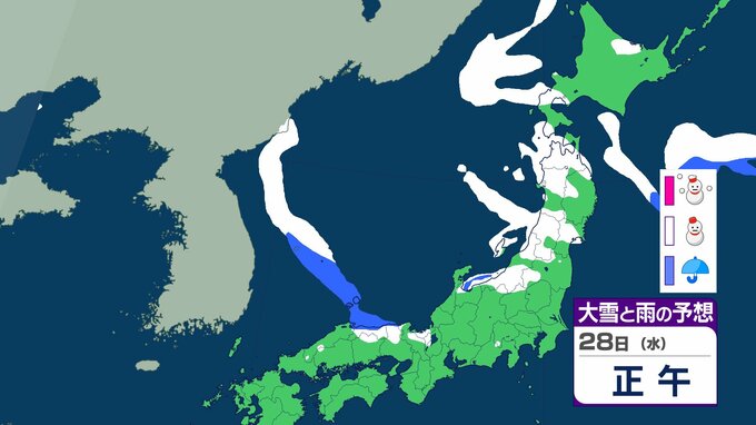 ニュースクリップ 【週間予報】29日(木)から再び強い冬型の気圧配置へ 日本海側は再び “警報級大雪” の可能性も…31日(土)は緩むも2月1日(日)は雨や雪へ【雪と雨のシミュレーション】 2026年1月26日(月) 11:30 国内 天気 28日(水)の雨と雪のシミュレーション