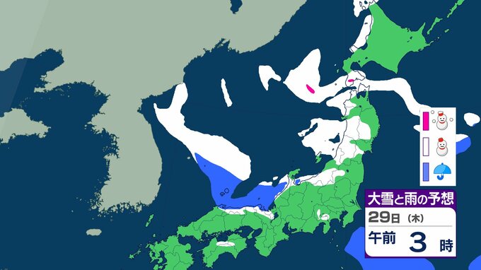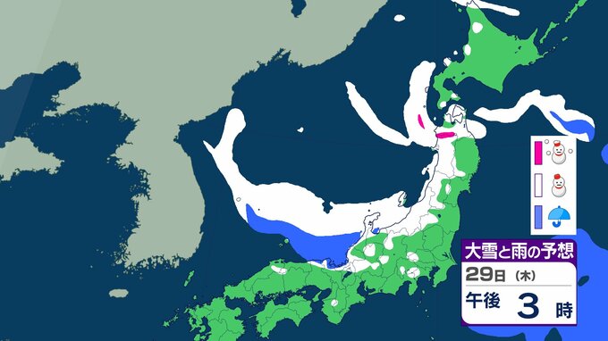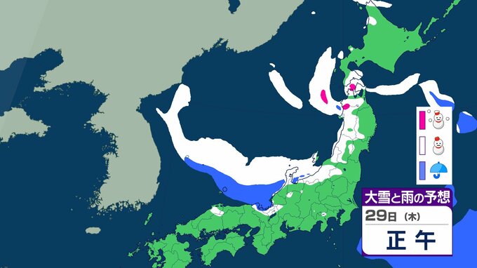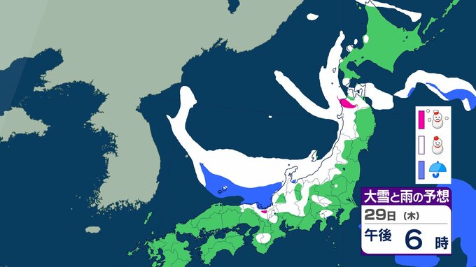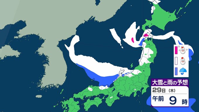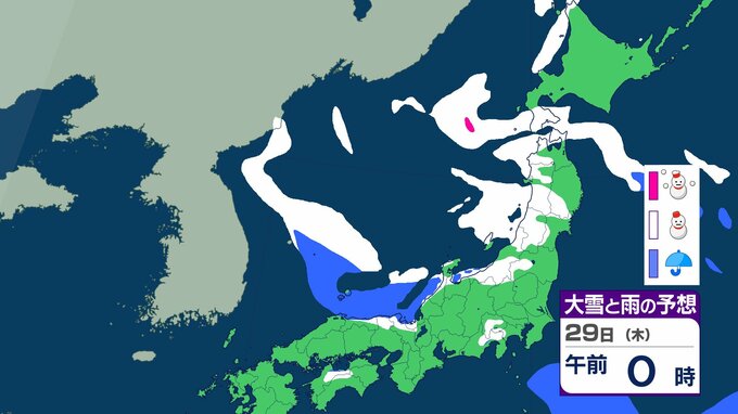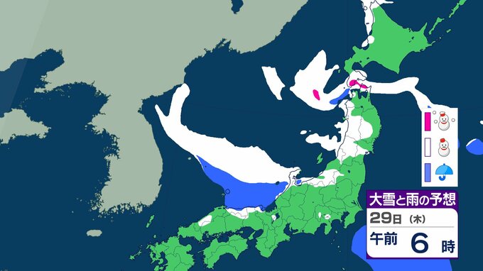 ニュースクリップ 【週間予報】29日(木)から再び強い冬型の気圧配置へ 日本海側は再び “警報級大雪” の可能性も…31日(土)は緩むも2月1日(日)は雨や雪へ【雪と雨のシミュレーション】 2026年1月26日(月) 11:30 国内 天気 29日(木)の雨と雪のシミュレーション